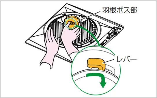 羽根ボス部のレバーを矢印の方向に押しながら外す。