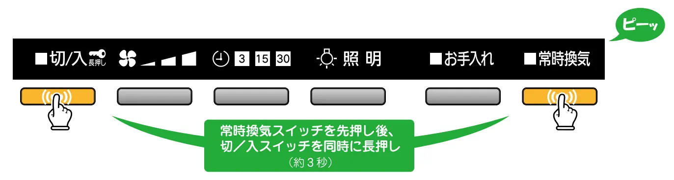 2 常時換気スイッチを先に押しながら、切/入スイッチを長押し(約3秒間)する
