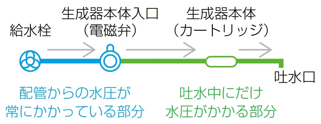 吐水中にだけ整水器本体(カートリッジ)に水圧がかかる方式