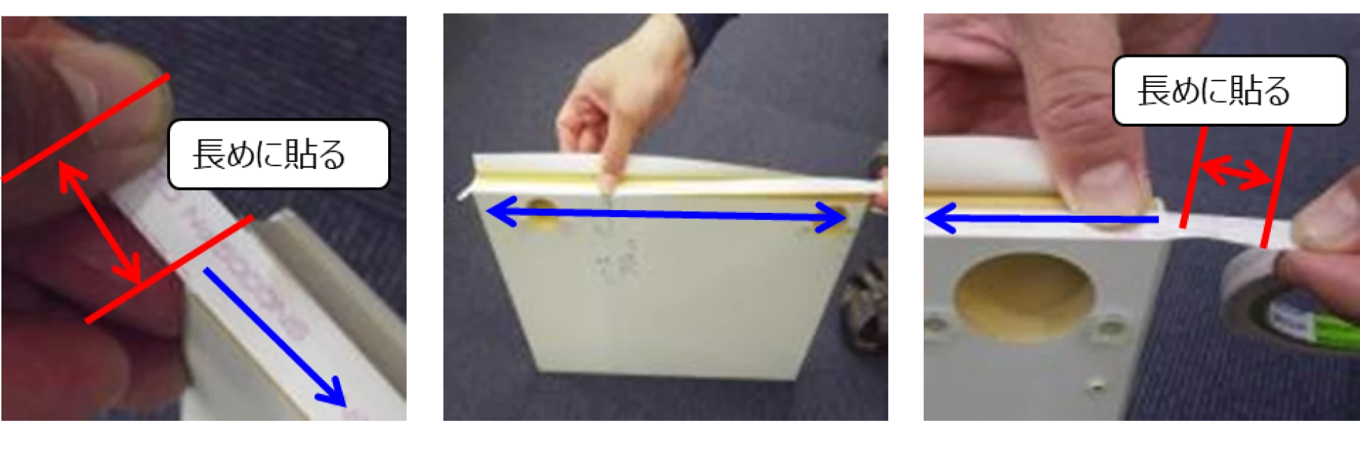 2 基材面の粘着部分を触らないよう、少し長めに貼ります。 (扉シートの角部に注意してください。)