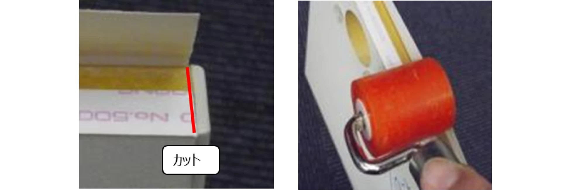 3 余分な両面テープはカッターナイフやハサミでカットし、両面テープをローラーでしっかり押さえます。