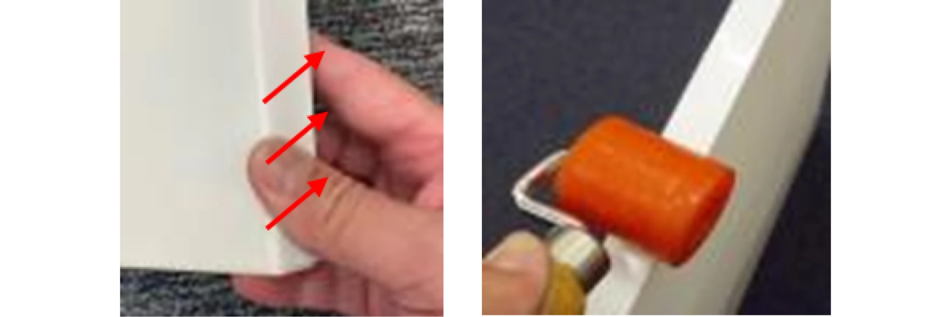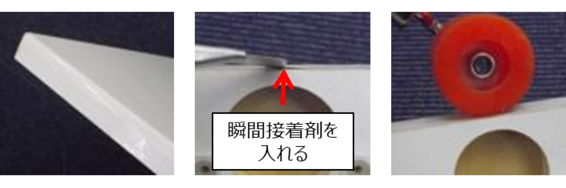 7 仕上がり確認をしてください。折れ目がついた扉などで隙間が生じた場合は、瞬間接着剤を入れて、ローラで押さえてください。(約2分程度)