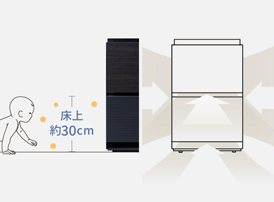 床上30cm付近に浮遊しやすい花粉やダニの糞・死がい、チリ、ホコリ、ペットのフケなどの重い汚れを、加湿空気清浄機で下から強力に吸引。さらに「抗ウイルス」「抗菌」「アレル物質抑制」の3つの性能を保持しているトリプルコートの床材で、衛生面や空気環境に配慮。
