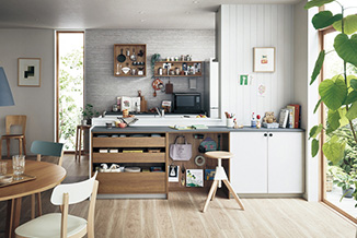 ⼀部をテーブルにすることで、勉強する⼦どもと向かい合って調理ができるキッチン。親と⼦どもの距離を縮めて、コミュニケーションがしやすいリビング学習の環境をつくります。