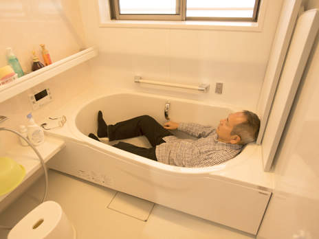 体質的にのぼせやすいので、あまり長く湯船につかっているとふらっとするのが心配で。ですからショウルームでリフォムスなら「おきラク手すり」が標準で付いていると知り、気持ちがグッと惹かれました。実際に使ってみると、“握る”というより、しっかりと身体を支えられる感じです。壁から壁まで横長のスタイルですから、洗い場から浴槽に入るまで手すりが使えて安心です。