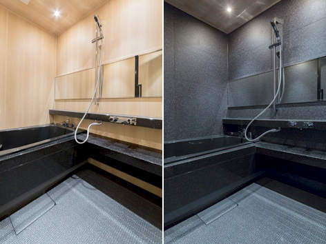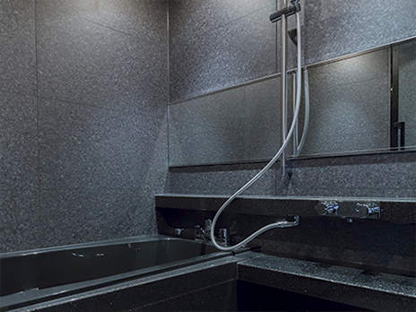 御影石の大判タイルのようなデザインの壁、浴槽などブラックで