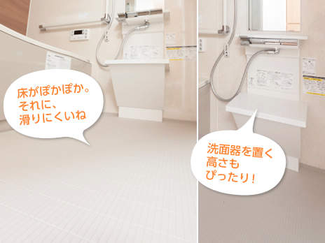 ちょうどいいサイズのあたたかいお風呂にしたくて、リフォムスを選びました。床暖房つきで、しかも床がすべりにくいから安心して入れます。カウンターも洗面器を使いやすい高さで、とっても気に入っています。