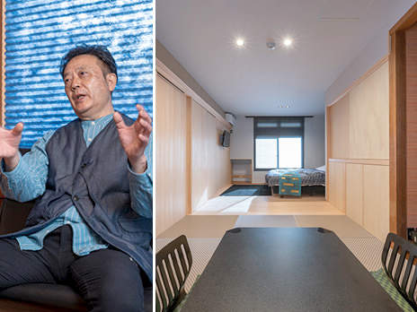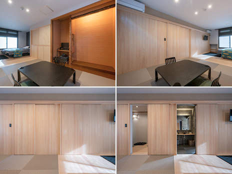 バスルームの出来上がりを見て、「この浴室にふさわしい客室にしなければ」とベッドや座卓なども新たに購入。これもブラックで統一しました。