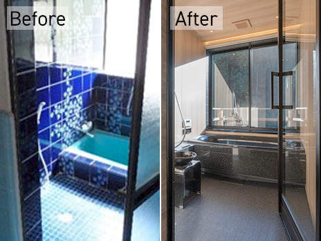 リフォーム後のバスルームでは開口いっぱいの窓から、日中は緑の渓谷が、夜はライトアップされた紅葉などが楽しめます。