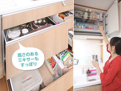 お鍋などの調理器具は、コンロ下にまとめて収納して使うときにサッと取り出せます。降ろせる吊戸棚「ソフトダウン・ウォールユニット」も便利ですね。
