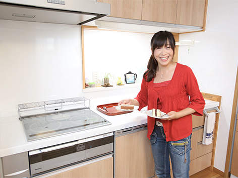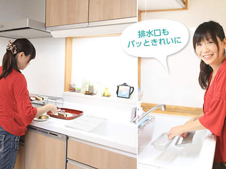 PaPaPaシンクは盛り付けにも使えてとっても便利。以前より45cmも小さくなったことを感じないんです。シンクや排水口のお掃除もラクで助かっています。