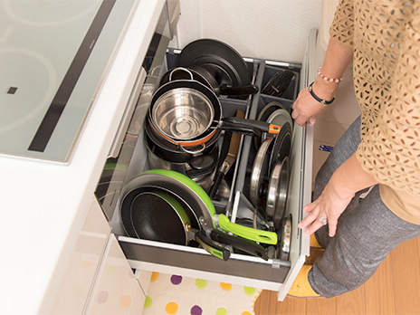 【リフォムスのここに満足!】フライパンが縦にすっぽり入るシンクにさまざまな鍋を1カ所に収納サッとふけて掃除がラクなIHに