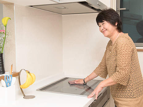 ビルトインのIHは平らで隙間が少ないから、全体を一気にふけます。いつも清潔にできるので、気持ちいいです。