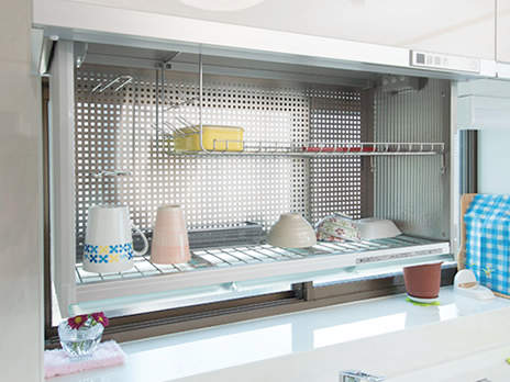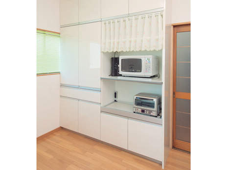 キッチンカウンターと同柄の扉のカップボード。食器すべてを収納でき、家電製品もおさまり、キッチン全体がすっきり。