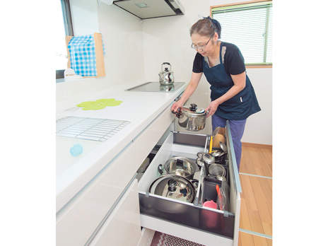 大きな鍋まで入るシンク下の大容量収納。大きな引き出しだから入っているモノがラクに取り出せます。