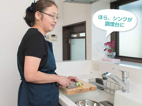 このシンクは、スライドネットにまな板を置いて野菜を切ると、ボールに切り落としていけるので、便利です。
