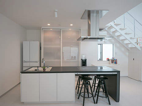 白を基調とした空間に、黒いカウンターが映えるスタイリッシュなキッチン。すぐ横の窓際にカウンターデスクを設置し、絵本やちょっとした玩具はこちらへ。その分、キッチンの上はモノがなく、すっきり。