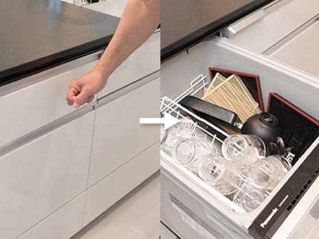 トントンとノックしてオープンする食器洗い乾燥機。食器のセットも、後片付け担当のご主人の仕事。