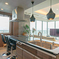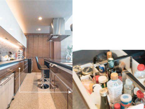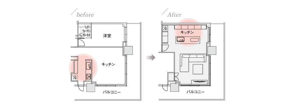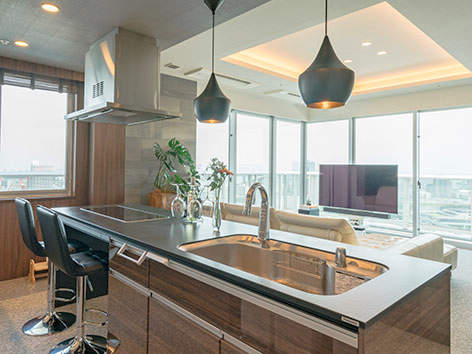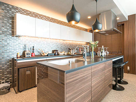 タワーマンションを購入されたH様は、洋室をなくしてLDKを拡張するリフォームを検討。それでも、もともとお持ちのL字型ソファを置くには若干狭い。間取りも決まり「小さめのダイニングセットを買ったほうがいいか…」と迷っていたとき、ショウルームで「いろりダイニング」に出会いました。ダイニングテーブルも兼ねたキッチンなら、スペースの余裕が生まれる!まさに二人の暮らしにぴったりと即決されました。