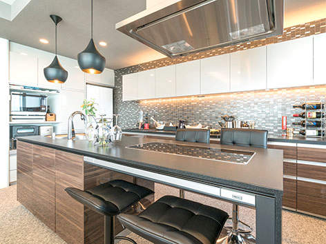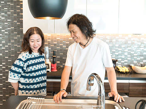 奥さまが「いろりダイニング」を気に入ったのは、できたてが食べられること。「サラダを食べながら、お肉を焼いたり…それもこれならできますよね。そのうえ動線が短いでしょ。食後、食器をシンクに運ぶ手間もなくなりました」。食事の楽しみが増しただけでなく、家事の負担が減ったことにもお喜びです。いくつものベネフィットを兼ね備えた「いろりダイニング」が、造形としてのシンプルさだけでなく「機能性にも優れたデザインが好き」というお二人の眼鏡にかなったのです。