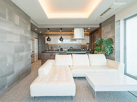 H様ご夫婦は食後お気に入りのソファで、ゆったり過ごします。キッチンで活動し、リビングでくつろぐ。そんなスマートな「LK(リビングキッチン)スタイル」は、お二人の理想の暮らしを生み出しました。