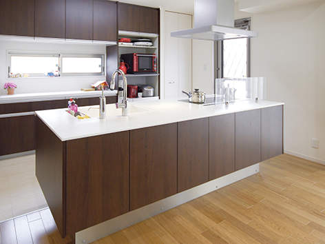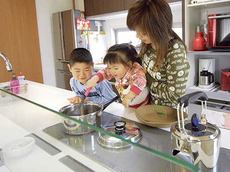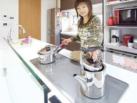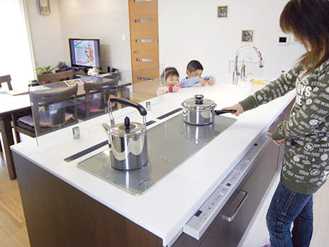 小さなお子様がいらっしゃるTさま。お子様の様子が見えるオープンタイプのキッチンがご希望でした。コンロは見た瞬間に"これだ"と思われたトリプルワイドIHをご採用。3口横並びで使える上、コンロの手前スペースで盛り付けもできるので、お料理の手際まで良くなったようと喜ばれています。