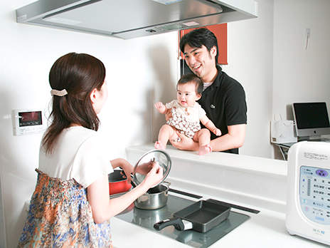 子供の誕生をきっかけに新築されたYさま。色々なメーカーのキッチンを見て、トリプルワイドIHの入ったパナソニックのキッチンをご採用されました。3口横並びで使えるので、自分たちのお食事をつくりながら離乳食もつくられるそう。ご主人がお料理づくりを手伝ってくれることが増え、奥様も喜んでおられます。