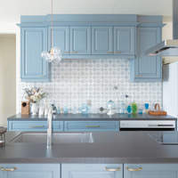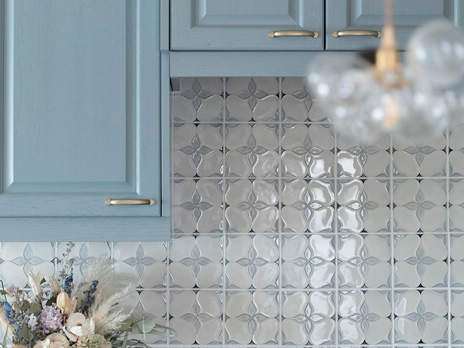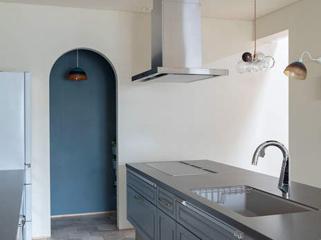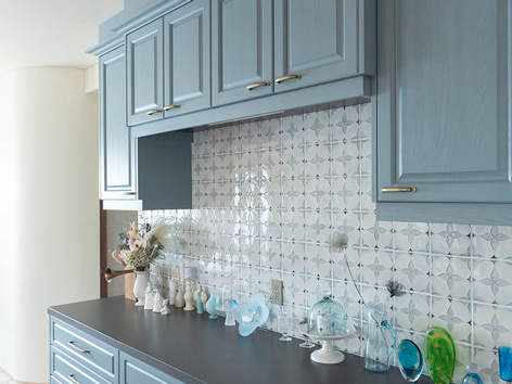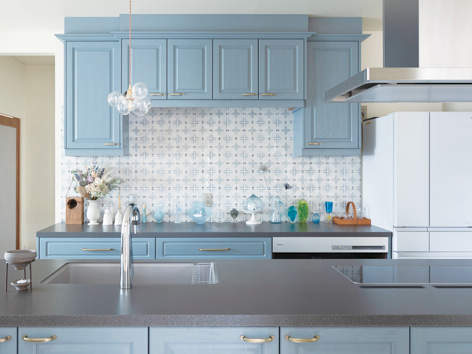 アメリカで手づくりされているレトロ柄のタイルに合わせた、アンティーク感のあるブルーグレーの扉色。凹凸のある“框組み”で仕上げています。