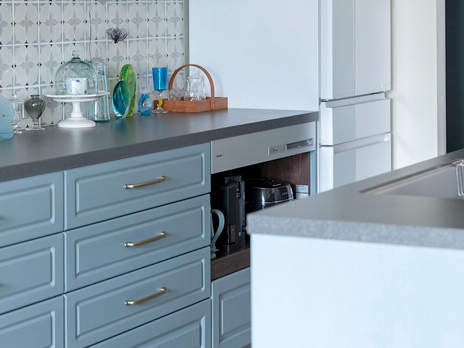 「担当の方に外国製キッチンのイメージ写真を見せたんです。するとぴったりのブルーグレー色があった上、扉色だけでなく凹凸の装飾が施された“框組み”と温かな木質感ある“突き板仕上げ”を組み合わせてみては?と提案いただいたんです。今までピンと来なかった理由は扉色だけでなくデザインにもあったのか!と眼からウロコでした」。そこで扉色とデザインを自由に選べる『Lクラスキッチン』で検討を進めることに。