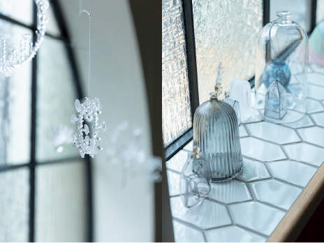 「キッチンを中心にお気に入りの空間が新居にはたくさん。季節ごとに大好きなガラス作品を飾り、家族で楽しんでいます」と奥さま。