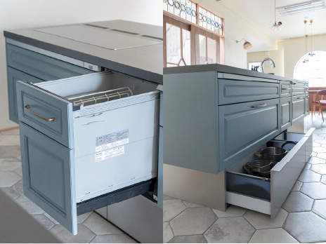 作業のしやすさを考慮し、設備類も充実。食器洗い乾燥機や自動水栓など、キッチン空間の雰囲気を壊さないようデザインにも配慮しながら、最新設備を導入されています。