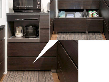 電子レンジを置いたキャビネット下の奥を、配管が通ります。そのためいちばん下の引き出しは浅め。「低い位置だから、かえって浅い方が使い勝手が良いです」。