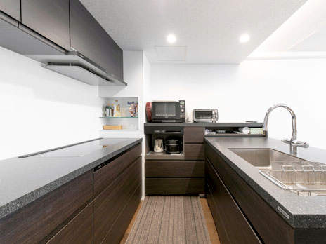 新居に元からあった床や建具の色にあわせて、キッチンはダークトーンでコーディネイト。黒で統一された家電とも馴染みます。