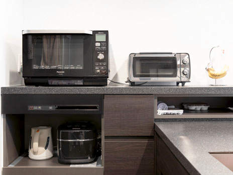 電子レンジの位置は、小さなお子さまは手が届かなくて安心でき、大人にとってはちょうど使いやすい高さ。以前のキッチンでよかった点は、積極的に活かしました。