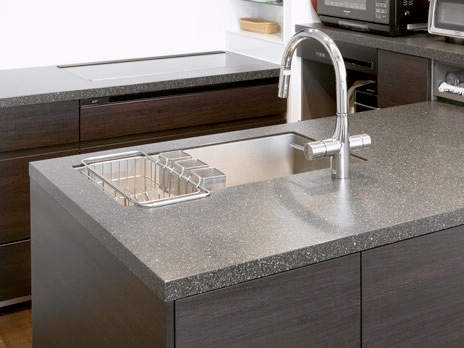 一目ぼれしたグラリオカウンター。木口部分は、工場で職人がひとつひとつ丁寧に磨いて仕上げているため、リビング側から見ても、美しさが際立ちます。
