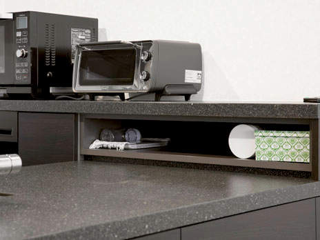 そんなMさまのアイデアは、他のキッチンにはないこだわりとして実現。たとえばシンク側キャビネットと、コンロ側キャビネットをつなぐコの字の部分の収納用キャビネットだけは打合せの結果、一段高くなっています。「旧居で電子レンジを置いていたキャビネットの高さが、とても使いやすかったので同じにしたかったんです。キッチンより高くなるけれど、その高低差の部分も、オープン収納として活用できるんじゃないかと思いました」。