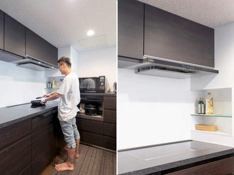 コンロはマルチワイドIHを採用。以前はレンジフードによく頭をぶつけたというご主人も「コンロが奥に納まっている分、レンジフードの出っ張りが少なくて、頭を打つ心配がない」とよろこんでおられます。
