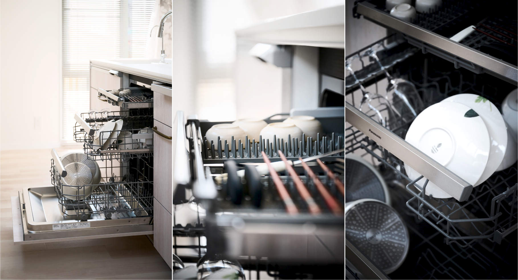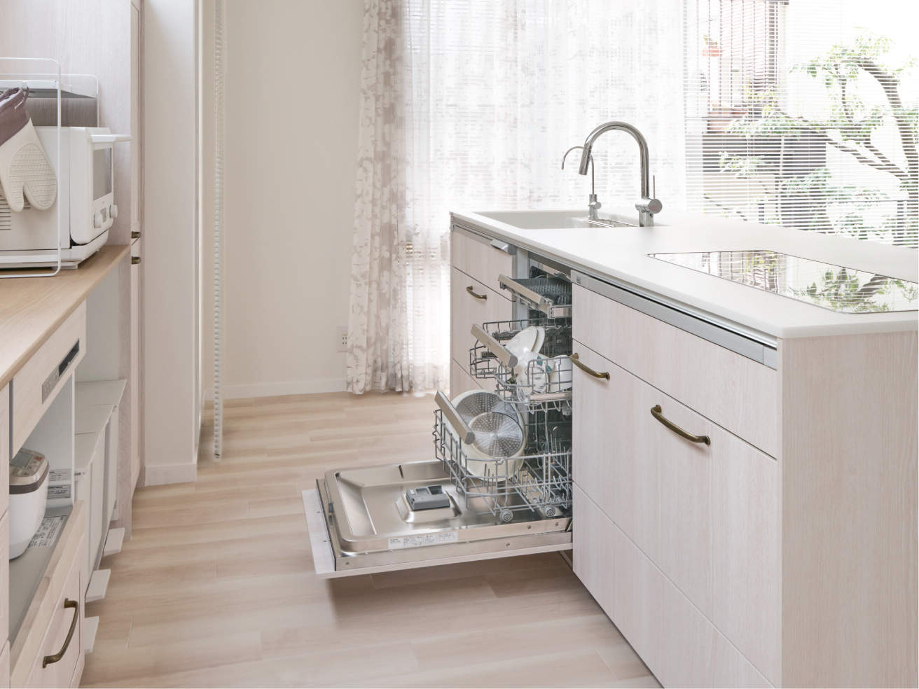 以前の食器洗い乾燥機は動線の都合もあり乾燥機能くらいしか使っていなかったK様。フルオープンで大きなフライパンの出し入れもラクに。