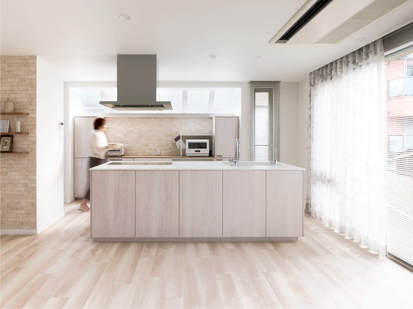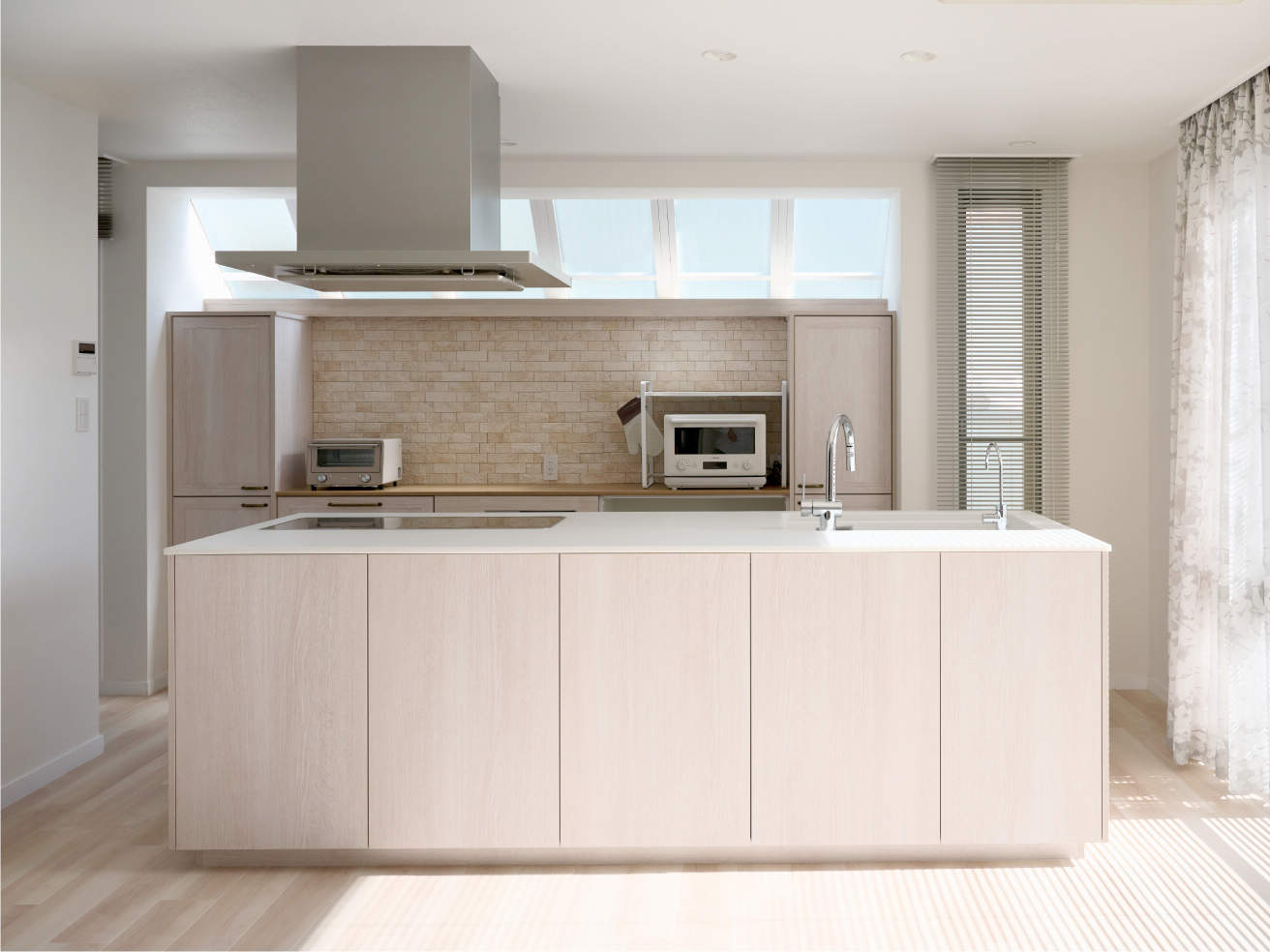 「手元が隠れるタイプの対面カウンタートップにするか迷いましたが、より広く使えるフルフラットにしてよかったです」と奥様。