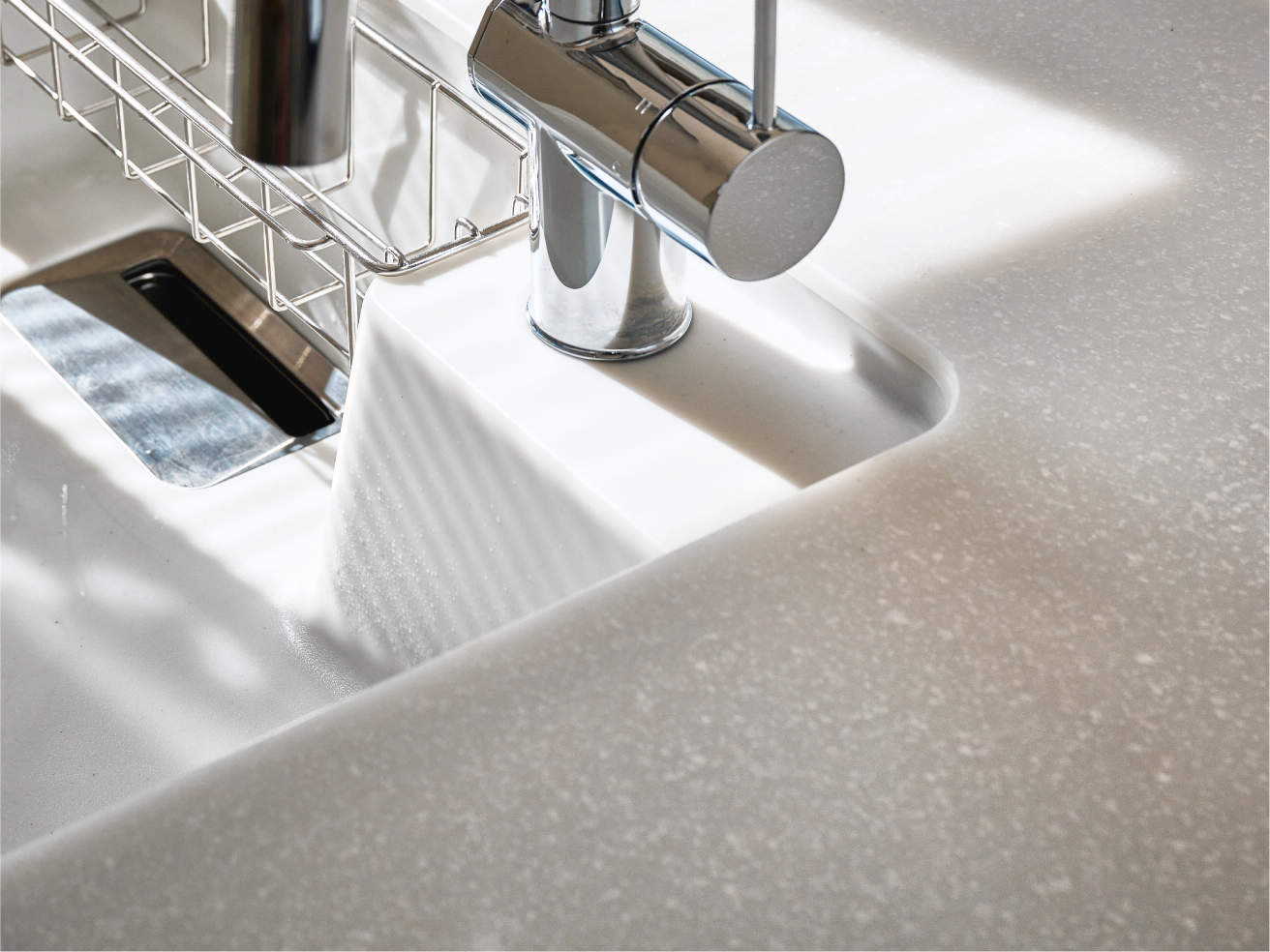 天然石の表情を再現した、美しく、お手入れが楽で、傷もつきにくいスゴピカ素材グラリオカウンター。ラクするーシンクとのスキマレス設計で汚れがさらにたまりにくい。