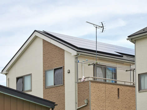 Tさまのお宅は、太陽光発電の効果が大きく見込める屋根の形状、向き。お子様が3人でこれから光熱費が高くなることが予想されるため、5年後、10年後までのシミュレーションをご提示し、太陽光発電+蓄電池の必要性を感じていただきました。